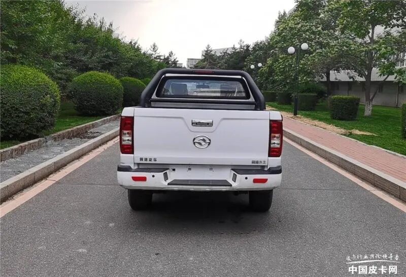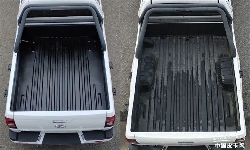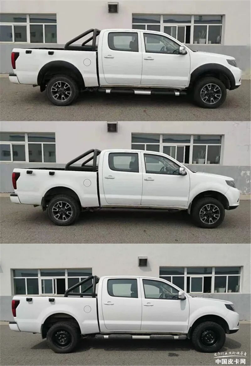 新车长宽高分别为5570*1770(1840)*1805mm,货箱尺寸为1815*1520*515(480)mm,轴距3385mm,轮胎规格为235/65R17、P235/65R17,额定载质量490kg,并且分为普通货箱和平底货箱两种样式。新车可选装前部(电镀框)组合灯具、电镀或与车身颜色相同的喷漆后视镜及门把手、轮眉、两种内部不同结构类型货厢、钢制轮毂以及ETC车载装置,可选择不安装前雾灯、车身两侧脚踏板。