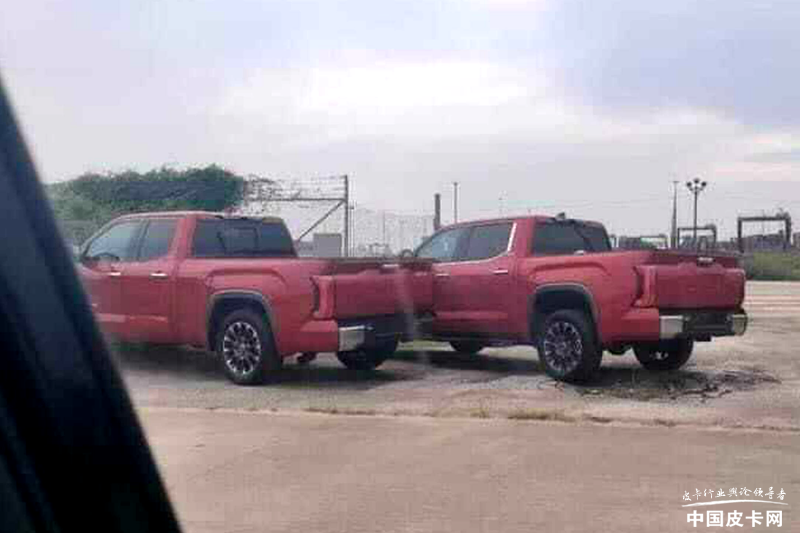 另外一张两车并排的谍照中,显示出该车拥有至少两种货箱长度和两种座舱长度,较短货箱的车型为双排车型,配备了侧踏板;而长货箱车型为一排半车型,但并没有侧踏板。两车尾灯相同,在上下端都有向车前延伸的倒角,很有标志性。