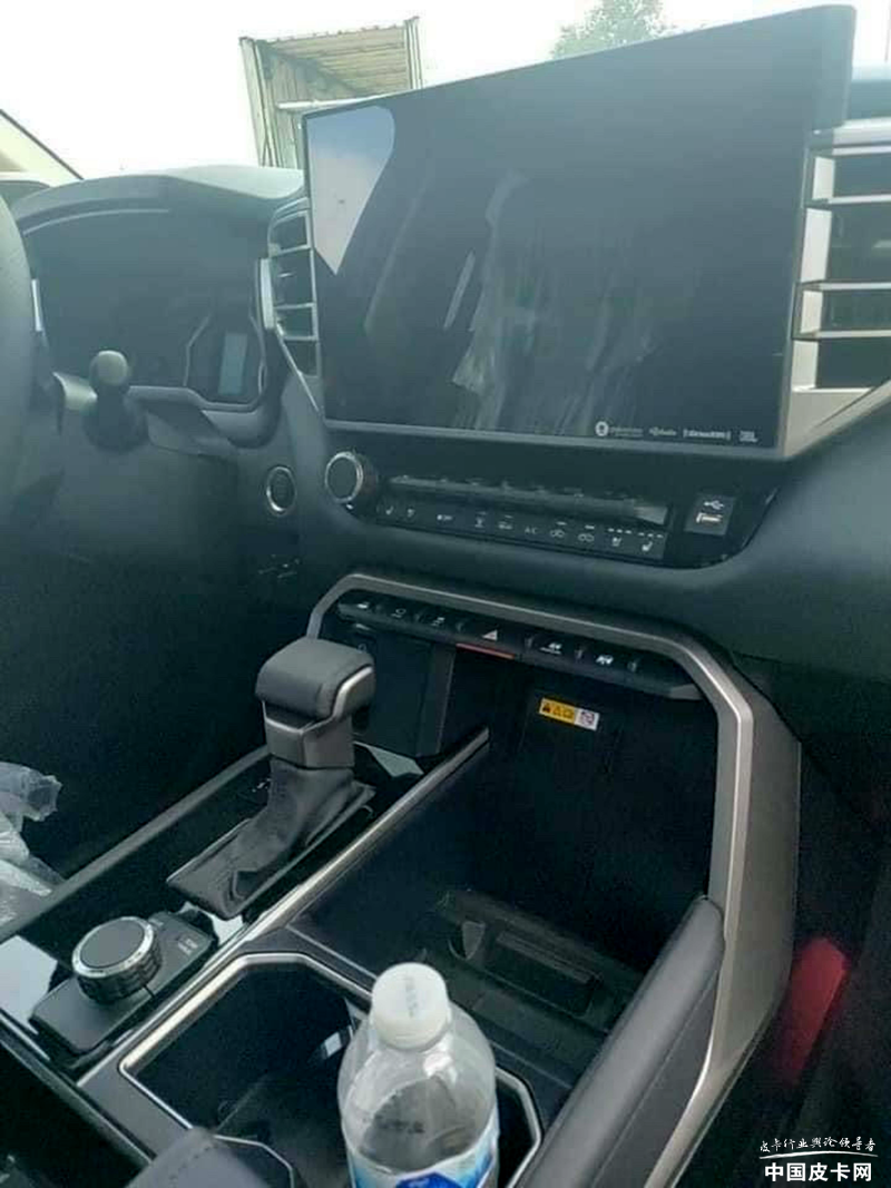 与此同时,车辆内部的照片也被曝光。中控台顶部配备一块12.3英寸显示屏,下方为空调控制按键和座椅加热/通风功能。在之前的报道中,全新坦途还将有较小尺寸屏幕的配置,预计为低配入门级车型。换挡杆为常规设置在副仪表板的样式,后方的旋钮功能并没有太多,预计缺少了一些TRD车型上偏向越野的辅助功能。座椅采用织物材质,比较朴素。