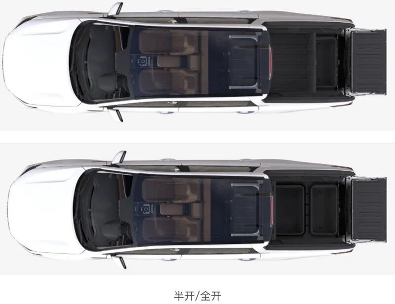 值得一提的是,该车的货箱与座舱采用了可贯通的设计,与大众的两款承载式概念皮卡类似,通过后排座椅后方可开启式的后挡板,实现货箱与乘员舱贯通。同时,货箱地板的部分还设计了可上翻的样式,内部还有两个封闭的存储空间。