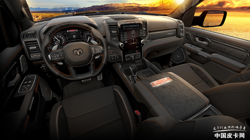 这款车基本上可以理解为Ram 1500 TRX创始版的年款车型,可以理解为起航版。该车外观整体呈现橙黄色的涂装,前脸部分大灯和中网部分采用纯黑色涂装,看上去十分凶猛。发动机舱盖上的进气孔和隆起均被保留。该车配备18英寸黑白双拼色轮毂,与全地形轮胎配合相得益彰。货箱部分带有黑色龙门架,内部配备可调节的锚点,实用性很强。
