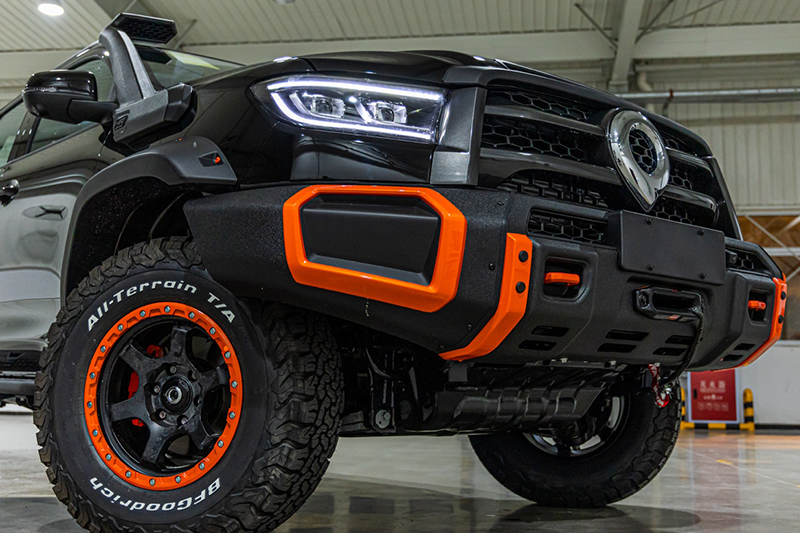 为了保证可靠的越野性能,长城炮黑弹采用了传统的分时四驱系统,可以应对高强度的越野环境。车辆的前后桥均配备了差速锁,可以增强特定情况下的脱困性能。高效可靠的传动系统与全面优化的底盘相结合,进一步提升了长城炮黑弹的综合越野能力。