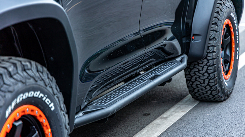 在野外穿越和冒险的过程中,沙石、泥土路面以及馒头坡等路况,考验着车辆的通过能力,同时也可能对车身造成损伤。长城炮黑弹设计出一组更加坚固的金属侧踏板,并将它直接与车辆大梁连接,使其既能够增强车辆底盘的抗冲击能力,也能够更好的保护车身侧面免于飞沙走石的撞击。