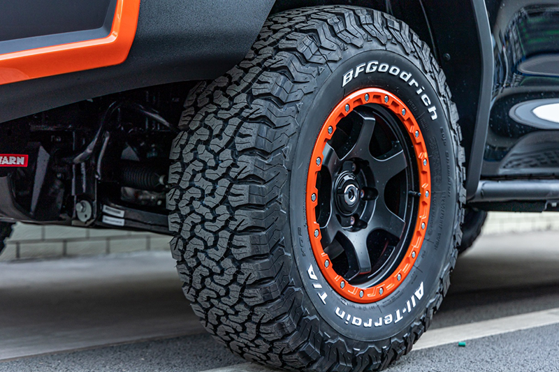 经过改装后的车身看起来很宽,主要是因为长城炮黑弹扩大了轮拱尺寸。车辆配备了胎面更宽、越野能力更强的百路驰KO2越野轮胎(适用于2021年6月18日前预定的车主),为了配合285/70 R17的轮胎规格,长城炮黑弹改装了轮眉,在拓宽车身宽度的同时,也能够符合法规标准。