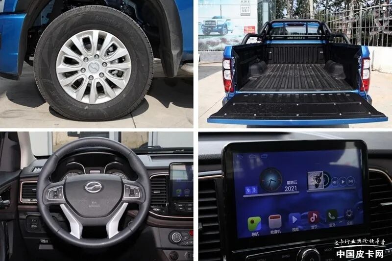 豪华型是威狮G7猎装版的入门级车型,配置也基本属于全系标配。外部配备了铝合金轮毂、喷涂货厢宝、货箱护栏、前部拖车钩、侧踏板、外绳钩、日间行车灯、后驻车雷达等;车内配备多功能方向盘、MP5中控台彩色大屏、蓝牙电话、手机互联、主驾驶安全气囊等;硬件配置包括液压助力转向、ABS+EBD、外后视镜电动调节等,基本上可以满足日常使用需求。