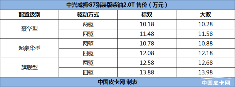 10月10日,中兴汽车威狮G7猎装版皮卡在唐山首发上市,新车搭载2.0T柴油发动机,按配置高低分为豪华型、超豪华型、旗舰型,并均有标双/大双、两驱/四驱车型可供选择,官方指导价10.18-13.98万元。威狮G7与中兴旗下的威虎同样采用“威”字命名,意在梳理产品体系,让车型更具家族元素。那么如此多款的车型该如何选择呢?