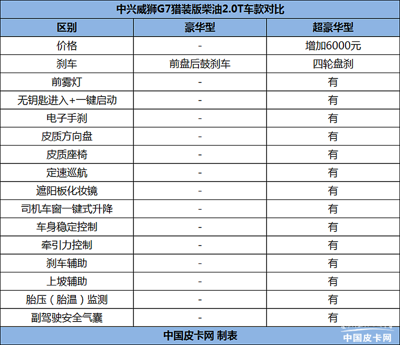 中兴威狮G7猎装版根据配置、驱动方式、标双/大双三个维度分为了12款车型,与配置相关的分为了豪华型、超豪华型和旗舰型三个级别。同配置级别中,四驱车型相比两驱车型贵13000元,大双车型相比标双车型贵1000元。那么我们就来分析一下不同配置级别到底有哪些差别。