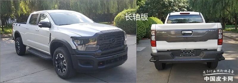 车身尺寸方面,标轴版长宽高分别为5393*2045*1910mm,轴距3230mm,货箱尺寸1530*1700*515mm;长轴版5692*2045*1910mm,轴距3513mm,货箱尺寸1810*1700*515mm。另外,所有车型的额定载质量均为495kg,并且拥有3吨的拖挂资质,轮胎规格均为265/70R18,接近角/离去角分别为23/25度。