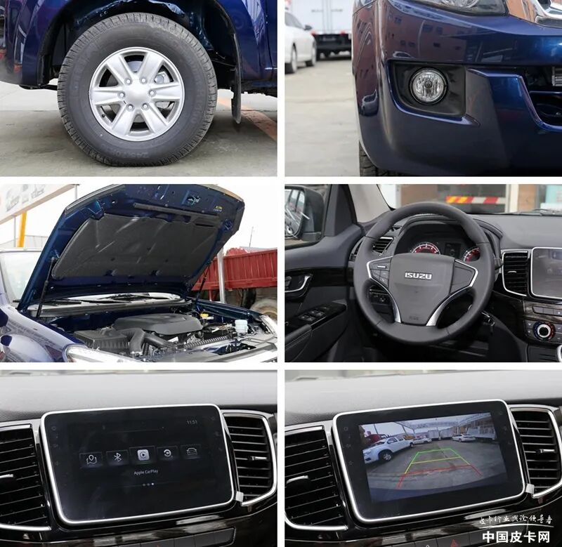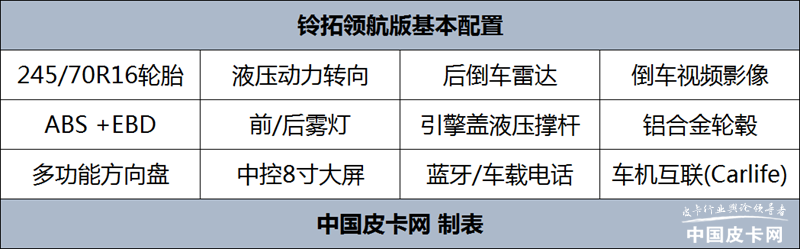 领航版也就是铃拓的入门款配置级别,它的配置也就是全系标配,诸如铝合金轮毂、245/70R16轮胎、液压动力转向、引擎盖液压撑杆等外部配置,还有后倒车雷达、倒车视频影像、ABS +EBD、前/后雾灯等安全配置,以及车内的多功能方向盘、中控8寸大屏、蓝牙/车载电话、车机互联(Carlife)等功能。从整体来看,基本上满足宜商宜家的要求。