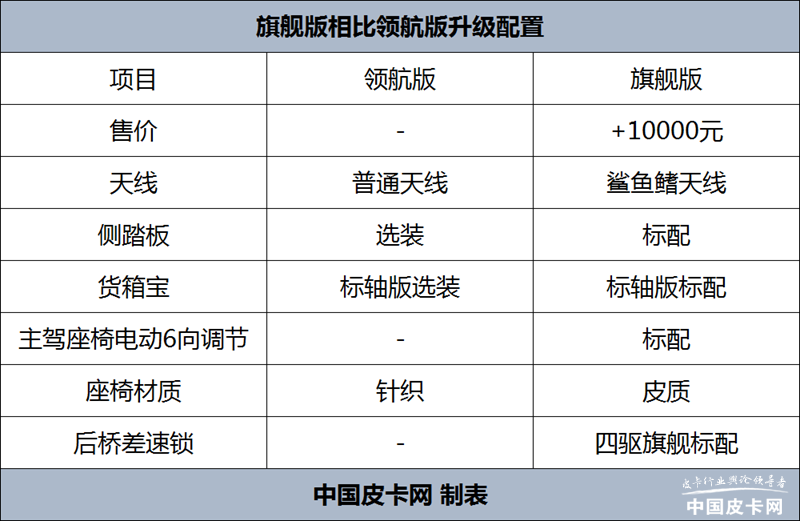 旗舰版就是铃拓的高配级别,它在领航版的基础上要增加10000元的购车预算,但增加的配置都比较重要,例如侧踏板、鲨鱼鳍天线,还有货箱宝从标轴版选装变为了标配、主驾座椅增加电动6向调节、座椅材质由织物变为了皮质,并且四驱旗舰版还增加了后桥差速锁的配置,这些升级配置相比增加的10000元预算非常有性价比。