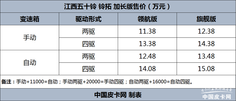 可以看出,铃拓加长版根据配置、变速箱、驱动模式几个维度共划分出了N多不同车款。同级别配置中,自动挡车型相比手动挡车型贵11000元,并且增加了驾驶模式选择、定速巡航、电子液压助力、前大灯延时关闭功能。驱动模式的划分比较有趣,手动四驱版车型相比手动两驱版贵20000元,自动四驱版比自动两驱版贵16000元。这样看来,自动挡车型和四驱版车型更具性价比。