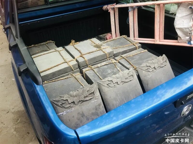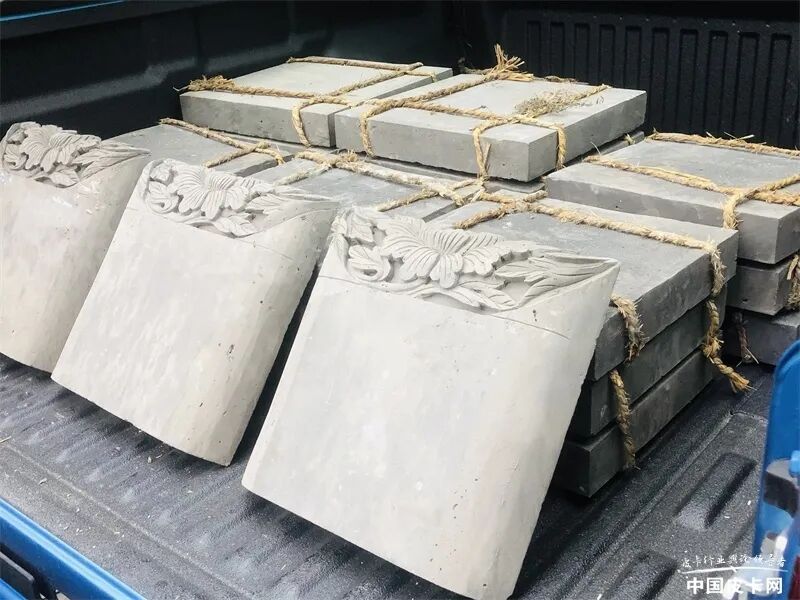 根据调查显示,平底货箱皮卡较普通版皮卡在货物装载量上可增加20%左右。但遗憾的是,我拉的这批砖是补货,因此量不大,锐骐6平箱版的容积优势没有利用上,全部青砖装下,在不超过货箱高度的情况下,只占用了货箱的1/3。听砖雕工人说,以锐骐6平箱版的货箱装载能力来看,对于一般规模的工程来说,一车一趟足以运够一批次所需青砖的数量。以五块砖一捆,装了足足近20捆的青砖作为参考,砖雕工人还表示,这个车装满砖应该没问题!