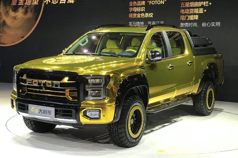 外观方面,龙腾大将军柴油8AT车型与在售车型保持相同。全车以龙为设计语言,整车采用炫动金色外观,非常亮眼。前脸部分棱角分明,气势感营造的非常到位,巨大的进气格栅中部带有FOTON字母标识,两侧的大灯非常有辨识度。车身侧面轮拱部分的外凸让整车力量感十足。黑金配色越野风17英寸轮毂搭配275mm越野宽胎,让整车气势提升的同时还增加了越野性能。