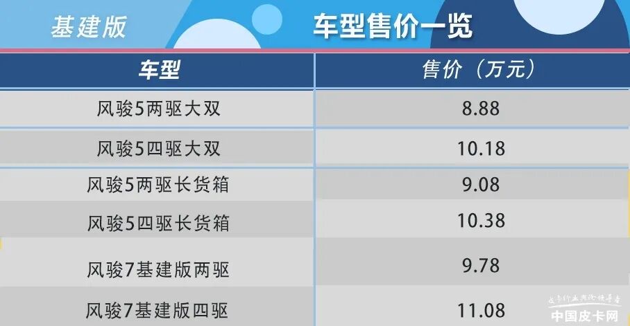 基建版是以风骏5、风骏7柴油进取型为基础进行研发的车型,货箱进行了加强。风骏5基建版指导价为8.88-10.38万元,风骏7基建版指导价为9.78-11.08万元。