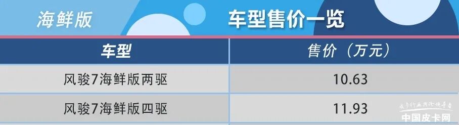 海鲜版车型是以风骏7精英版为基础进行升级的车型,在货箱防腐防锈方面做出了强化,官方指导价为10.63—11.93万元。配置方面,海鲜版配备了防滚架防护网、底盘装甲、不锈钢货箱宝、制氧器开关等配置。该车车身核心部件采用镀锌板多达88处,车架经受720小时盐雾试验,经酸洗处理后电泳,具备更高的强度及防锈防腐能力,有效降低维护费用。
