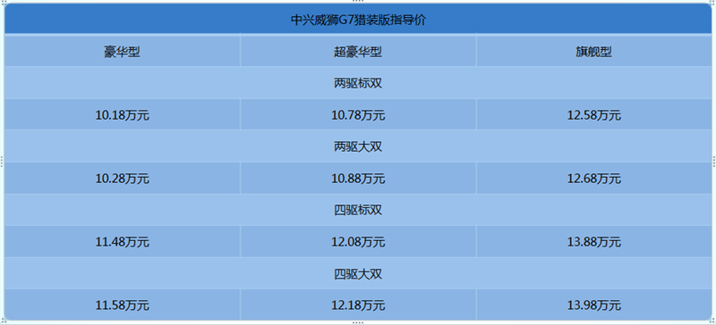 10月10日,中兴汽车威狮G7猎装版皮卡在唐山首发上市,新车搭载2.0T柴油发动机,按配置高低分为豪华型、超豪华型、旗舰型,并均有标双、大双、四驱车型可供选择,官方指导价10.18万元-13.98万元。