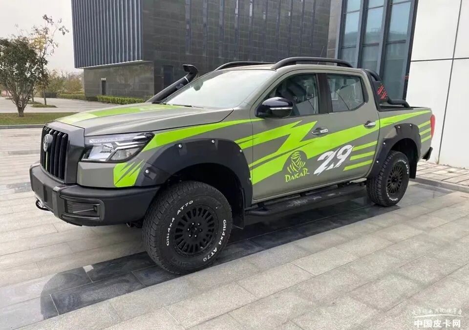 曝光车辆的外观与早前工信部过审的图片相似度极高,全新样式的中网采用了熏黑处理,非常有辨识度。车辆的越野气息也比较浓郁,宽大的保险杠、涉水喉、绞盘、全地形轮胎等一应俱全。此外,该车的涂装也非常野性,多元素的汇聚让车辆外观并不单调。