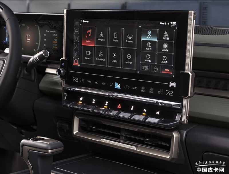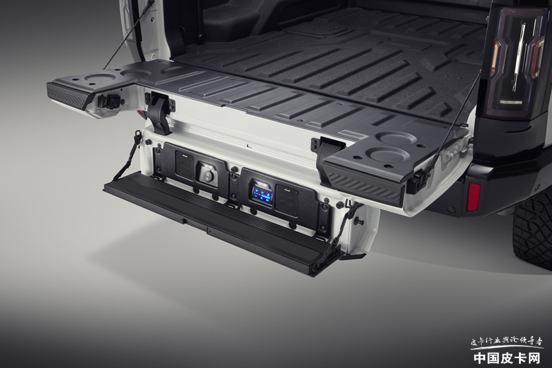 这些展出的产品中,包括一些非常实用的配件,比如电动伸缩货箱盖、货箱侧置储物格、集成侧踏板的底盘护板、货箱备胎架等等。当然,除了实用以外,也有装饰性的配件,比如红色或青铜色的车身拉花装饰,各种车轮图案等。而那些需要用电的电动附件,为了方便操控,悍马纯电动车型的信息娱乐系统中将配备虚拟辅助开关,这样在加上配件后不用增加实体开关,让整车保持纯电动车型的统一性。