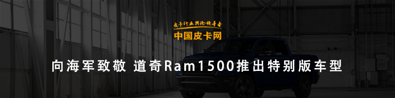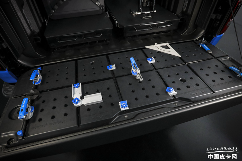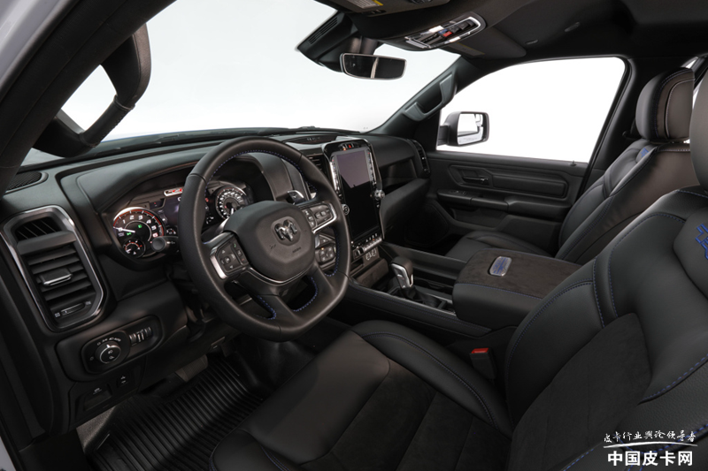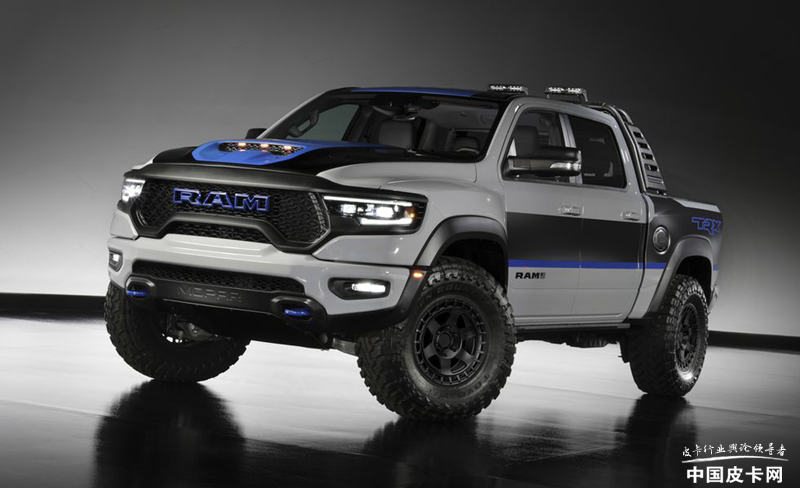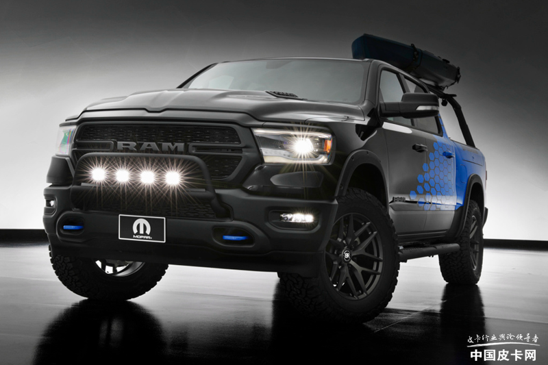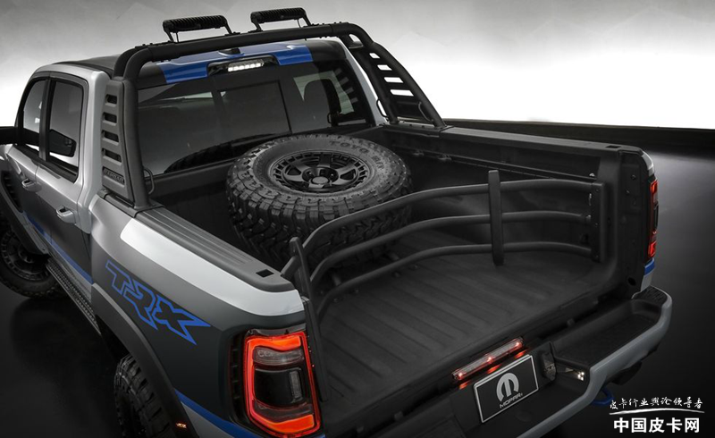 整车采用独特的车身涂装,黑蓝灰相间十分醒目。最明显的是轮胎部分的改装,该车采用了定制的18英寸黑犀牛轮圈和37英寸越野轮胎,让整车看上去野性十足。而由于轮胎的更换,以及前后下护板的配合,还有定制侧踏板的加持,让整车的接近角提高到了32.5°,通过性更强。货箱部分还集成了一款定制式防滚架,并且带有两个14英寸的LED光源用来补光。货箱下端还设计了两个5英寸黑色Mopar排气尾喉,让整车也拥有了一丝运动元素。