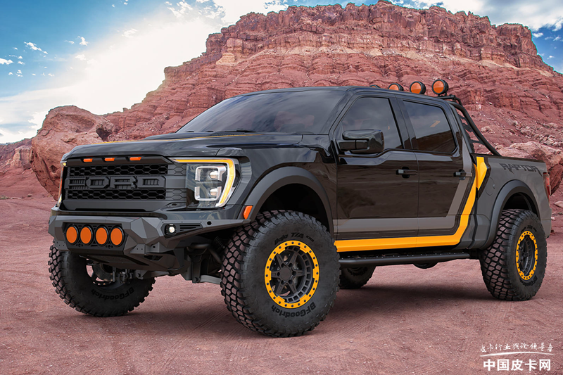 这款猛禽明显是偏向沙漠竞速类型,硬件部分换装了前后保险杠,货箱内部设计了备胎架,定制侧踏板,并且在前杠和防滚架部分均带有改装品牌的光源。百路驰BAJA轮胎也证明了这款车可以在沙漠中狂奔。