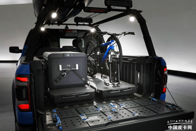 Ram带来的另外一款车则是偏向户外风格的Outdoorsman概念车,整车采用前黑后蓝的渐变色涂装,更加突出。货箱部分带有铝合金龙门架,上方可以放置大件物品。而货箱内部更是别有洞天,带有滑轨的设计可以轻松的在货箱内部装卸物品。而在尾门部分还设计了Mopar RamGate任务台,可以当做测量工具。除此以外,整车升高了2英寸,配备20英寸黑犀牛轮毂以及35英寸大陆轮胎。
