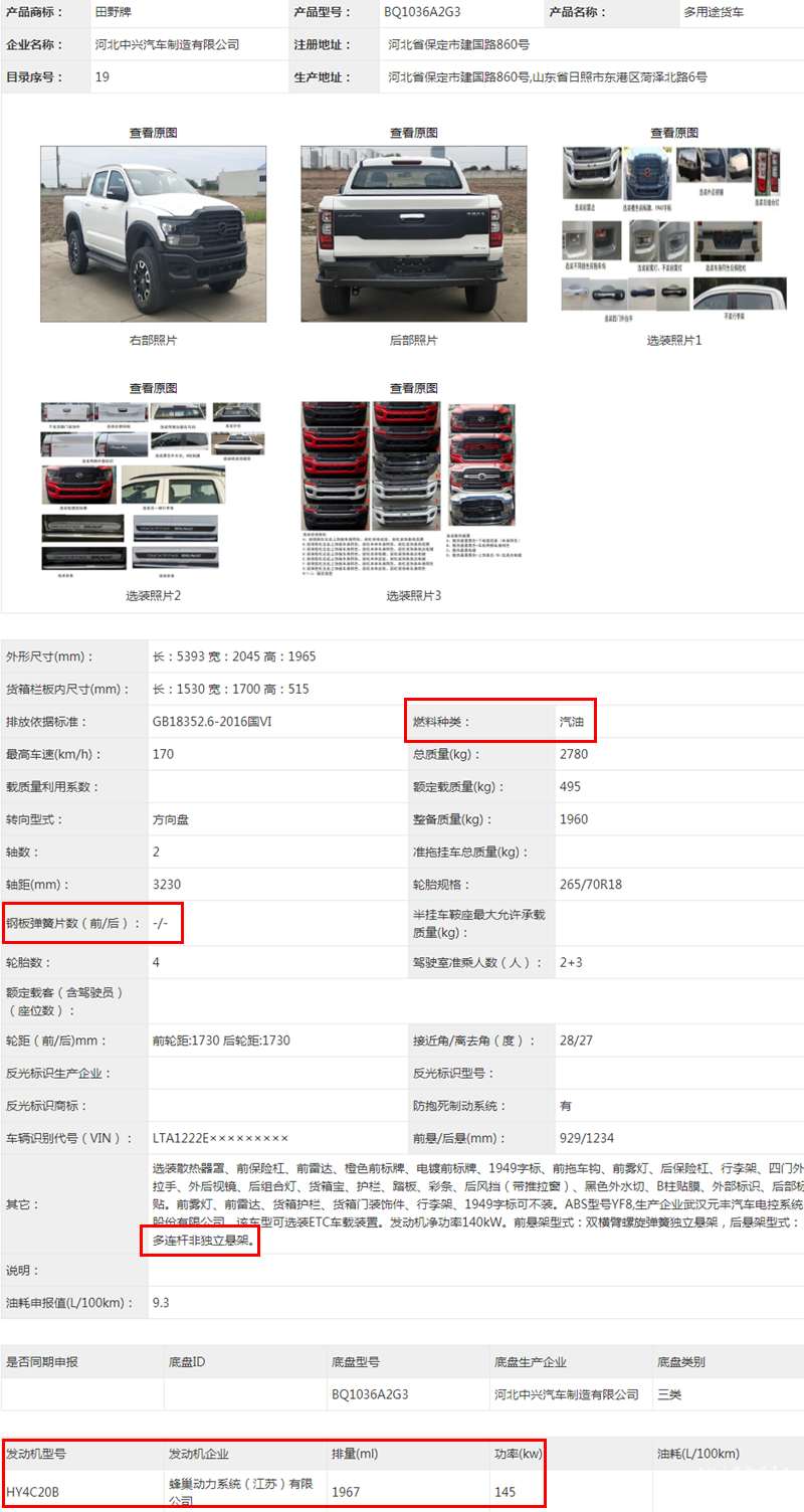 前不久,中兴皮卡公布了旗下全尺寸皮卡的命名——威狮1949。这款全尺寸皮卡也是中兴相当重视的一款车型,预计将成为旗下的旗舰车款。在之前公布的消息中,这款车将会推出商用版、乘用版、竞技版三款来主攻不同市场,其中乘用版和竞技版将采用后螺旋弹簧+多连杆+整体桥的结构。最新一期工信部申报信息中,也证实了这一点。