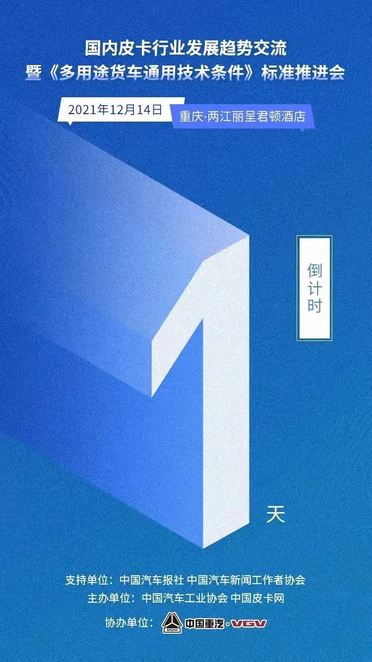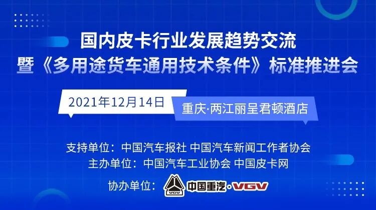 为了深入交流相关情况,在中国汽车报社、中国汽车新闻工作者协会等多家机构的大力支持下,由中国汽车工业协会、中国皮卡网联合举办,中国重汽VGV协办的“国内皮卡行业发展趋势交流暨《多用途货车通用技术条件》标准推进会”将于12月14日在重庆召开。
