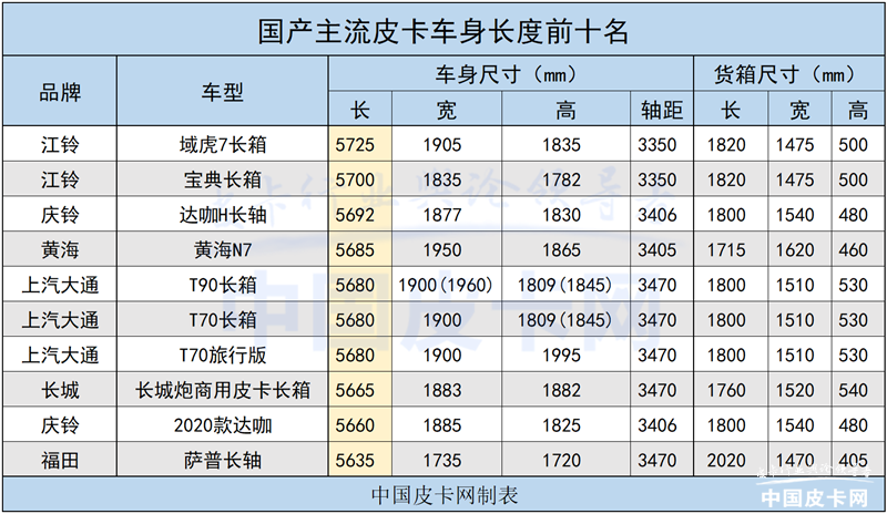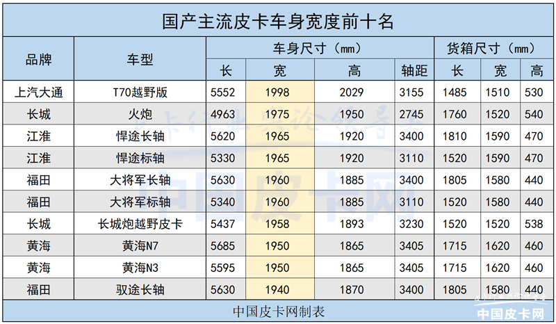 今年7月,中国皮卡网曾对国内市场在售的主流皮卡车型尺寸进行了详细整理,其中,江铃域虎7长箱版以5.73m的车身长度位居第一,上汽大通T70越野版则以接近2米的车宽成为国产皮卡中最宽的车型。同时,中汽协对2020年皮卡销量做了分析,在当年已售车型中,车长小于5.3m的皮卡销量占比为9.9%,而车长小于5.5m的占比60.3%;车宽小于1.8m的占比30.2%,车宽小于1.9m的占比80.7%。