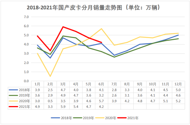 前不久,中国皮卡网从中汽协获得了2021年6月国产皮卡工业销售数据:6月国产皮卡销售41906辆,环比增长-10.63%,同比增长-25.91%;1-6月累计销售283483辆,同比增长33.9%,高于货车销量增速14.5个百分点,皮卡市场表现依然强势。