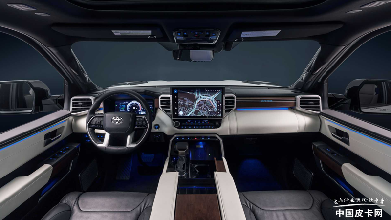 2022款丰田坦途Capstone车型仅提供5.5英尺长(168厘米)标准货箱版本,内饰在现有基础上进行了一定修改,采用黑白双色设计的半苯胺真皮座椅,且前后排座椅都具备通风加热功能。仪表盘、中控台、车门采用深色美国胡桃木装饰,方向盘为四幅式真皮方向盘,标配全景天窗,车窗采用了隔音玻璃,可以使驾驶舱更安静。