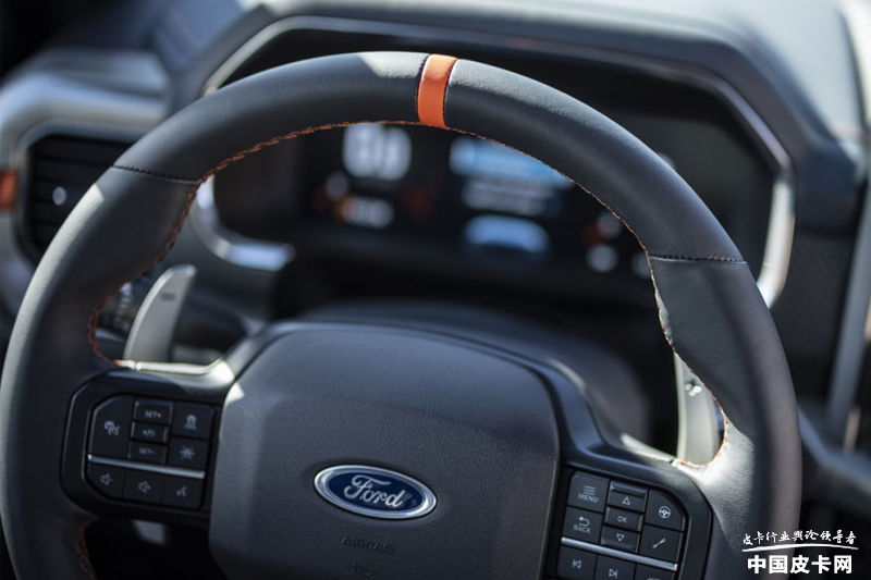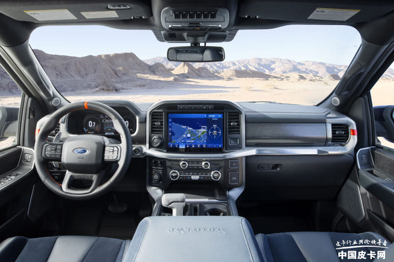 内饰造型仍旧是福特F-150系列固有的格调,四平八稳的中控台造型通过细节线条的处理,很好的体现出豪华感与精致感。福特F-150猛禽内饰的整体更风格与普通版福特F-150差异不大,车内加入了橙色饰条,中控台安装了碳纤维饰板,在扶手箱以及座椅的表面,提供了猛禽LOGO的压花徽标,更能彰显全新福特F-150猛禽与众不同的身份。