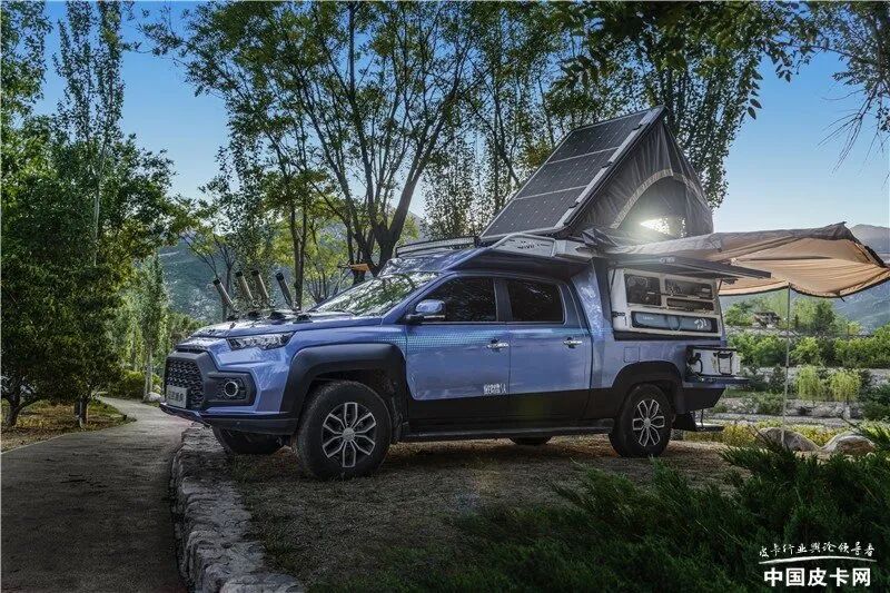 车辆顶部和后部是钓鱼版与普通版皮卡区别之处。在车顶,域虎钓鱼版设计了导流板和行李架,并在前部配备了LED条灯,用来在光线不足的时候进行补光,尤其适合夜钓爱好者。后部改装为封闭货箱,车顶带有长2米、宽1.2米的升顶帐篷,采用了电动起落的控制方式,只需要操作遥控便可完成开启和关闭。