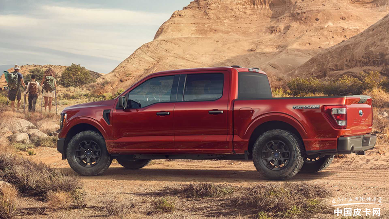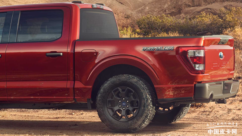 F-150响尾蛇基于XL(入门版)车型打造,采用了双排座四驱款的造型。外观部分与普通版车型有明显区别,前翼子板后方的通风口处带有Rattler标识,货箱侧面的贴花更加明显,并且还增加了蛇皮纹路,很有个性。车辆尾部采用双边双出排气布局,增加整车的性能氛围。18英寸铝制轮圈搭配越野轮胎,与轻度越野的定位相符。