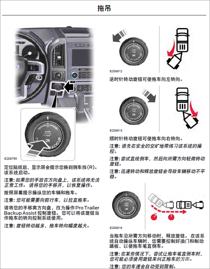另外在拖挂文化发达的地区,以“拖挂”为中心的辅助系统在皮卡上非常常见,譬如辅助拖车系统、拖车稳定系统等等。而拖车的最难点在于倒车,因为多轴的驾驶系统会与两轴车型有所区别,也正因为这点催生了拖车倒车辅助系统。以福特为例,F-150就配备了此系统。在设置好了拖车的相关参数后,只需要控制一个旋钮就可以操作拖挂列车完美的倒车,相当方便。