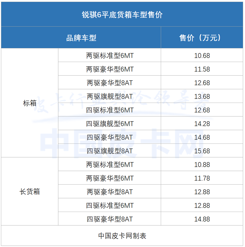 平底货箱版的锐骐6外观与现款车型一致,延续了硬朗的整体风格,取消了两侧轮包的货箱更加平整,对实际装载容积有显著的提升。新车配备了双安全气囊、9英寸中控屏、AVM360影像(含倒车影像)、智能钥匙(无钥匙进入+一键启动+发动机防盗)、多功能信息显示屏、差速锁等智能化配置,还有货箱宝、防滚架、内绳钩等实用配置。