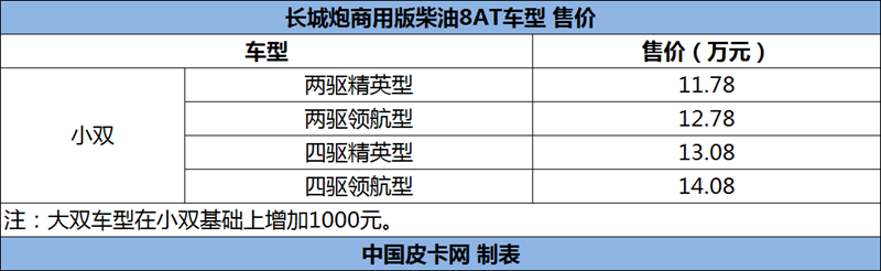 作为长城面向商用市场的核心产品,商用炮在整车设计上更注重实用性,柴油8AT车型的售价也并不高。商用炮柴油8AT车型有小双和大双可以选择,共有8款细分产品,售价区间为11.78-14.18万元。此外,去年年底,长城在炮系列的基础上推出了共创产品茶王版,商用炮茶王版提供柴油四驱6MT与8AT两种动力选择,8AT车型售价为14.28万元。
