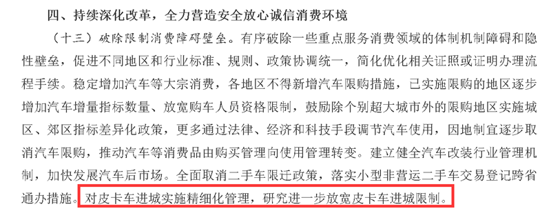 4月25日,《国务院办公厅关于进一步释放消费潜力促进消费持续恢复的意见》(以下简称《意见》)正式发布,文件第四条第13点明确提出,要求各省、自治区、直辖市人民政府,国务院各部委、各直属机构,对皮卡车进城实施精细化管理,研究进一步放宽皮卡车进城限制。
