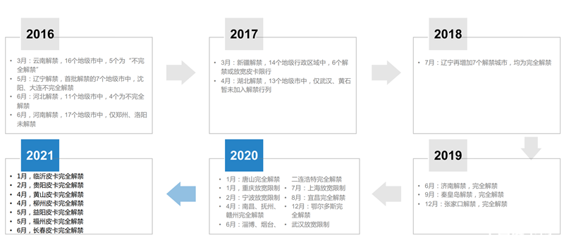 2021年,新增11城放宽皮卡进城限制,皮卡可畅行区域继续扩大,其中,湖北武汉、吉林长春、贵州贵阳、新疆乌鲁木齐、黑龙江哈尔滨等核心城市或省会皮卡解禁,皮卡开始向一二线城市迈进,皮卡解禁成为行业共识。