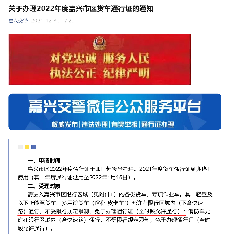 皮卡解禁一直是很多卡友关注的重点新闻,我们在报道任何一条解禁政策的时候,都有大量的网友留言回复,足以证明这类信息的关注度。最近,国内又有几个地区放开皮卡进城限制。首先是去年年末,浙江省嘉兴市发布了《关于办理2022年度嘉兴市区货车通行证的通知》,通知中提出,多用途货车(俗称“皮卡车”)允许在限行区域内(不含快速路)通行,不受限行规定限制,免于办理通行证(全时段允许通行)。