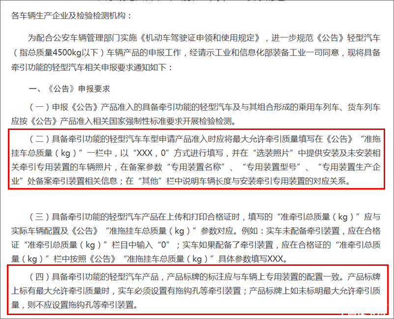这一要求无疑为消费者解决了很大烦恼,在后期加装挂车的时候可以省去加装拖车杠的步骤,让消费者用车更加省心省事。另外,在实施要求中还介绍到,已经申请公告的车型可以通过变更扩展完成车辆信息的补充。
