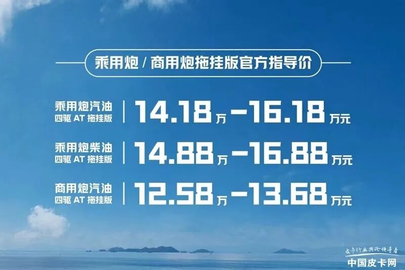 长城炮第30万台整车下线仪式已经在不久前隆重举行,同时乘用炮、商用炮拖挂版正式上市。近日,我们得到乘用炮/商用炮拖挂版的正式售价:乘用炮汽油四驱AT拖挂版售价区间为 14.18万-16.18万元,乘用炮柴油四驱AT拖挂版为14.88万-16.88万元;商用炮汽油四驱AT拖挂版为12.58万-13.68万元,后续会推出商用炮柴油拖挂版。新上市的拖挂版车型其实就是在乘用炮、商用炮四驱AT车型上增加2000元。