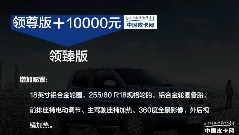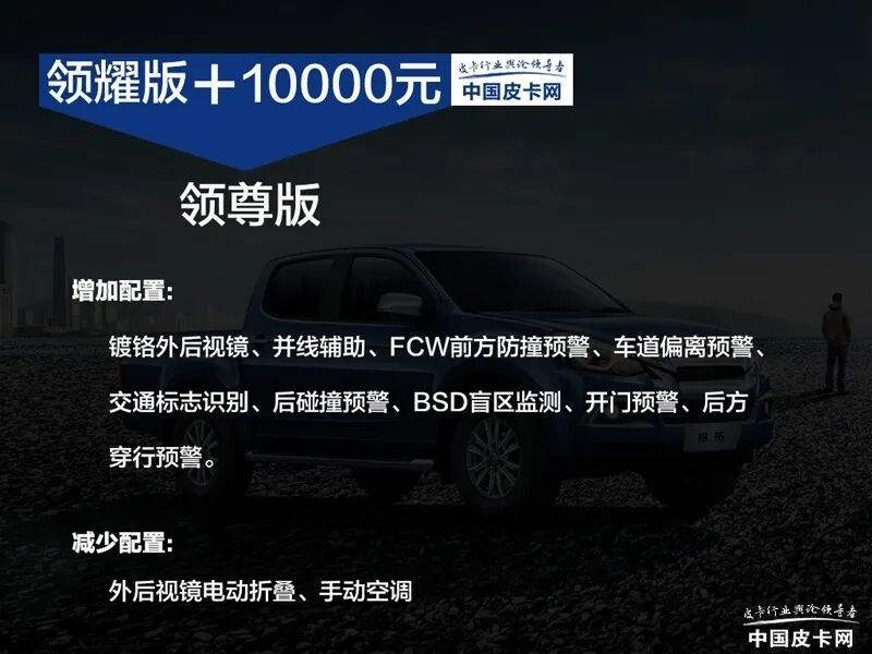 在领耀版的基础价位上,增加1万元就可以得到领尊版。相比之下领尊版在外观方面增加了镀铬装饰后视镜,并且在主动安全上进行了极大提升。不过,领尊版可能受制于成本因素,相比第一级的领耀版却少了外后视镜电动折叠,自动空调也变成了手动。在我看来,领尊版的主动安全配置的升级虽然拉升了铃拓GANK汽油版的智能化配备,但对于大部分皮卡用户的用车环境来说,其实这1万元的升级意义不大。