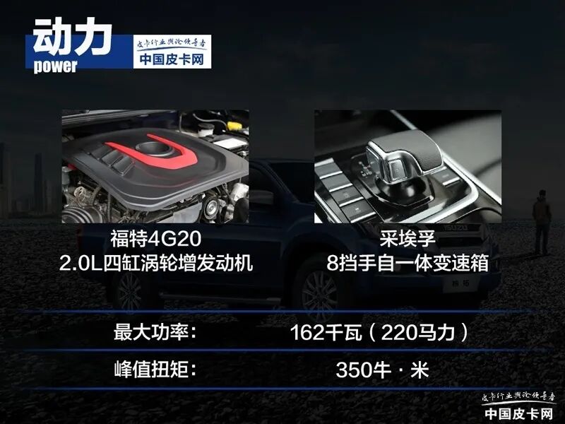 江西五十铃铃拓GANK汽油版采用了2.0L四缸涡轮增压发动机,最大功率达到162千瓦,峰值扭矩达到350牛·米。单从参数上来说,和自家柴油1.9T相比,扭矩参数差异不大,可在功率方面占据较大优势,毕竟汽油发动机拥有更高的转速,动力延展性更好。另外,汽油机也不用考虑尿素和DPF自洁问题。与这台发动机配备的是来自采埃孚的8挡手自一体变速箱。目前铃拓GANK汽油版的8个配置车型,都采用的是这一套动力系统。