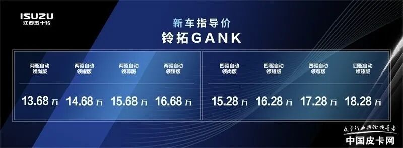 5月10日,江西五十铃铃拓GANK汽油版正式上市,新车共推出8款车型,官方指导价为13.68-18.28万元。新车采用了2.0L四缸涡轮增压发动机,最大功率达到162千瓦,峰值扭矩达到350牛·米,传动系统匹配采埃孚8AT变速箱,底盘方面采用了双叉臂式独立前悬架+五连杆后悬架系统。