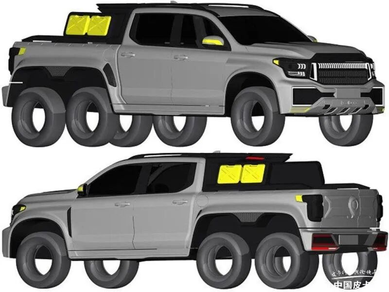 本周,在专利局网站中,曝光了一组长城6轮皮卡的专利图。其实在很早之前,长城就有制造6轮皮卡的计划,只不过当时一直在内部讨论阶段。而此次曝光的专利图则显示了这个计划实施的可行性。从专利权人来看,这个6轮皮卡的专利归属两个单位,其中之一是长城,另一方则是广州超境汽车科技有限公司,也就是之前长城的赛博SUV的设计公司。所以以此来看,这款6轮皮卡很有可能是会量产的节奏。