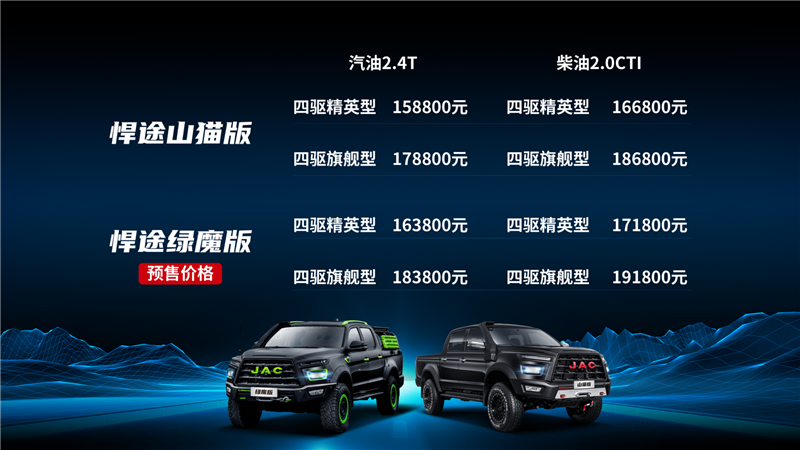 作为硬派皮卡倡导者,江淮皮卡不仅追求产品品质过硬,更倡导勇敢追求精彩生活,与用户同频共振、深度共创。在此次仪式上,2022款悍途山猫版、悍途绿魔版等悍途共创车正式开启预售。