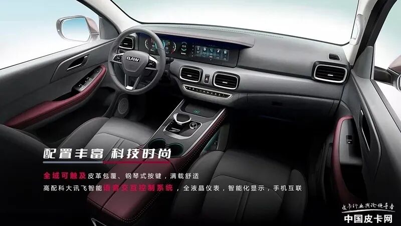 内饰方面完全打破了皮卡的传统印象,整体风格与家用SUV无异。整车内部融入了国风元素,并且以大面积的皮质和软质材料覆盖。平底多功能方向盘、悬浮式中控屏等应有尽有,还配备了一键启动、360度高清环视摄像头+随动倒车影像等。