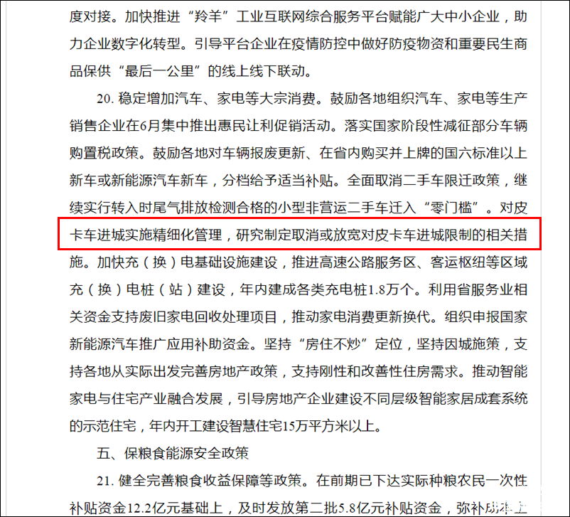 随着国务院在《关于印发扎实稳住经济一揽子政策措施的通知》中明确“对皮卡车进城实施精细化管理,研究进一步放宽皮卡车进城限制”之后,全国多个省份紧接着推出各地相应措施。我们在安徽省政府官网中看到,安徽于6月2日发布了《稳住经济一揽子政策措施实施方案》,其中第20条中明确提出:对皮卡车进城实施精细化管理,研究制定取消或放宽对皮卡车进城限制的相关措施。这也是安徽首次省级发文提及皮卡解禁相关事宜,预示着皮卡限制问题已经受到了省级政府的重视。