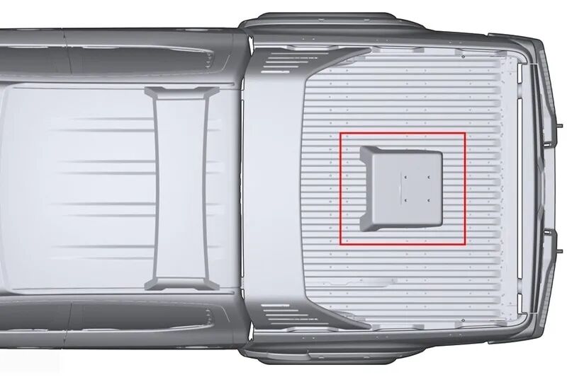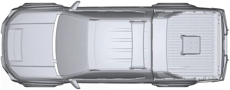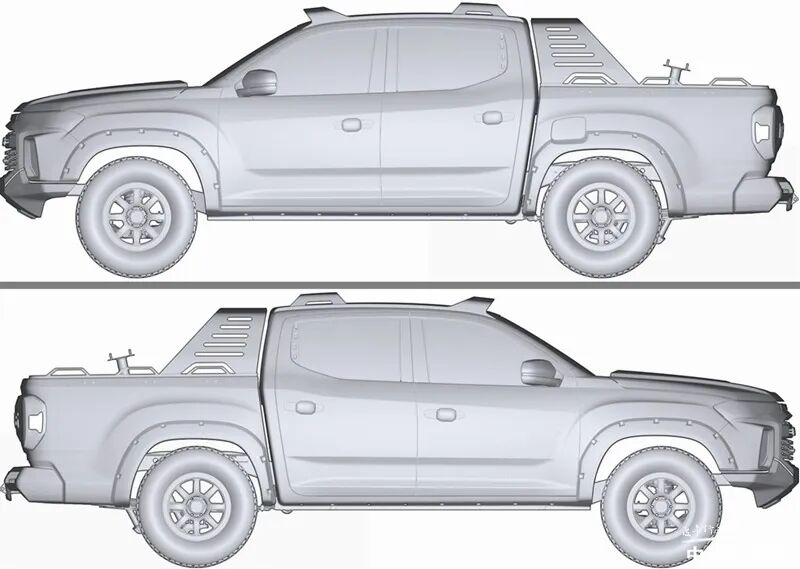 车身侧面可以看到,该车车顶的行李架和运动式防滚架与之前展车基本一致。但是值得注意的是从侧面可以看到货箱中带有一个装置。从后视图和俯视图猜测来看,该车这个装置很有可能是牵引座。