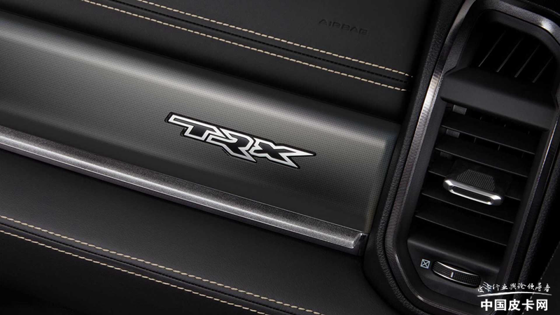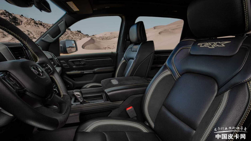 车辆内部也有单独的元素设计,整体造型没有变化。TRX沙漠版采用浅黄色缝线点缀黑色内饰,座椅靠背上的刺绣也采用浅黄色样式,让车内环境与外观呼应。另外,车内还带有碳纤维以及皮质包覆,提升精致的感觉。扶手箱前方带有特殊铭牌,印有该车的VIN、发动机信息、马力、增压压力和美国国旗等,彰显该车与众不同。